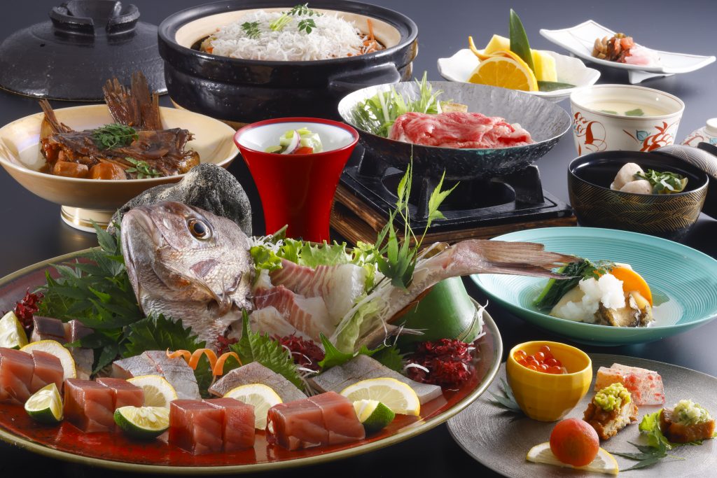 さらにお楽しみの夕食は新鮮な海の幸と、ほっこり美味しい牛すき鍋が同時に楽しめる会席料理。